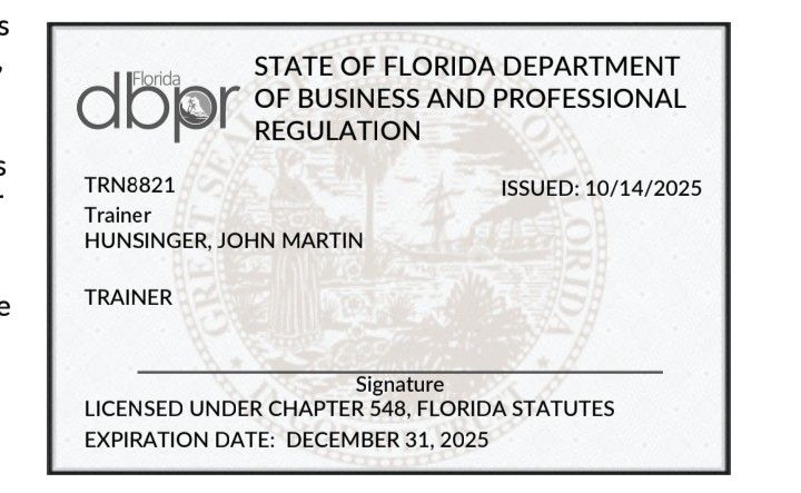 Licensed by the Florida Athletic Commission to instruct MMA professional, and non professional for competition and self defense.